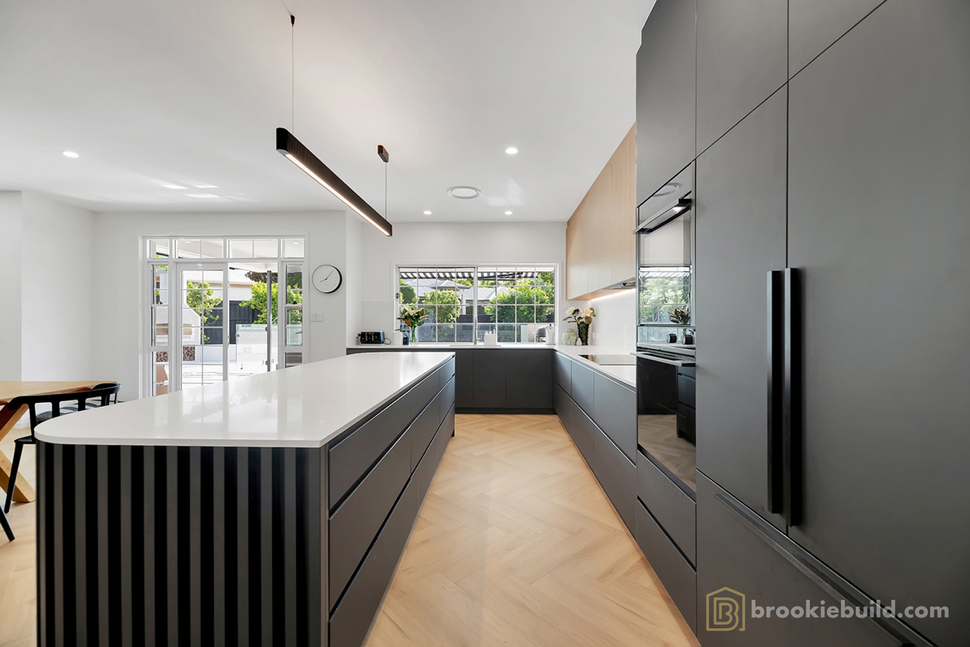 The heart of this Fig Tree Pocket renovation is the sleek, open-plan kitchen and dining area. A space once closed off by walls is now a seamless hub for family life, anchored by a stunning custom-built island featuring soft curves and a minimalist profile. This showstopping centrepiece pairs light and dark contrasting cabinetry with a modern stone benchtop, setting the tone for the entire home’s design—a blend of sophistication, contrast, and warmth.